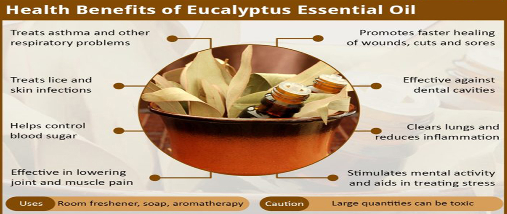 The health benefits of eucalyptus oil are well-known and wide ranging, and its properties include anti-inflammatory, antispasmodic, decongestant, deodorant, antiseptic, antibacterial, stimulating, and other medicinal qualities. Eucalyptus essential oil is colorless and has a distinctive taste and odor.